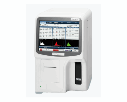本装置は、血液中の白血球3分類、赤血球、血小板など21項目の測定結果を表示・印刷することが出来ます。また、白血球、赤血球、血小板3項目の粒度分布をグラフに表示し、印刷することが出来ます。